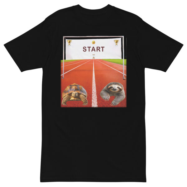 A race between a tortoise and a sloth at the starting line. It may take a while to see who won, but this fun design makes both the winner!