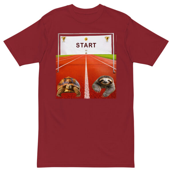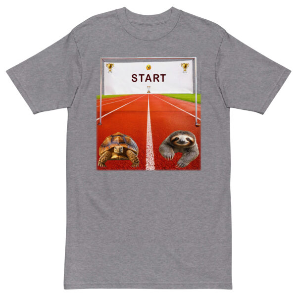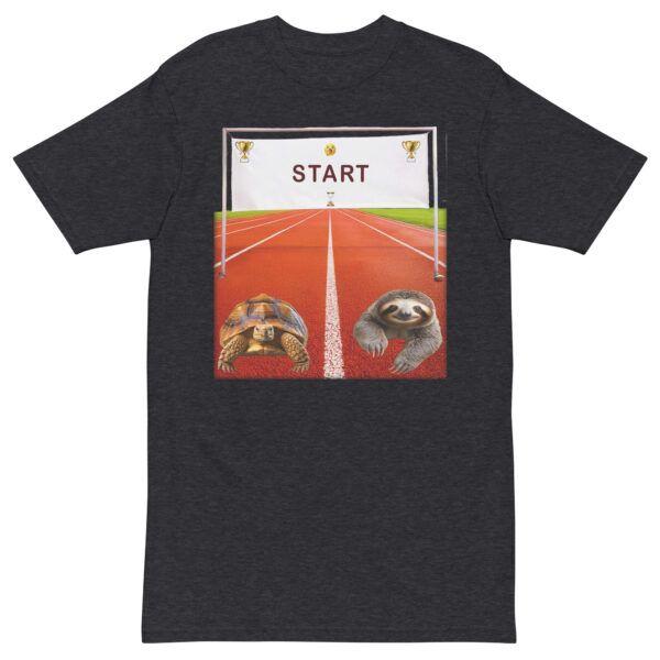 A race between a tortoise and a sloth at the starting line. It may take a while to see who won, but this fun design makes both the winner! A structured fit that is both durable and soft, with an open ring-spun cotton material. • 100% combed ring-spun cotton • Charcoal Heather and Carbon Grey…