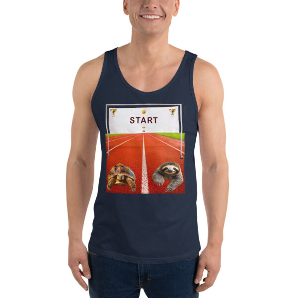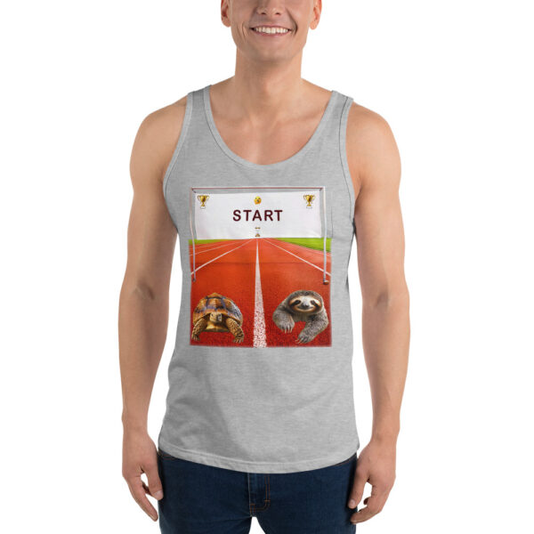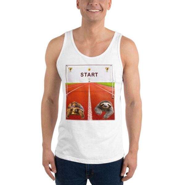 A race between a tortoise and a sloth at the starting line. It may take a while to see who won, but this fun design makes both the winner!