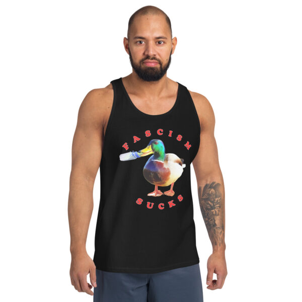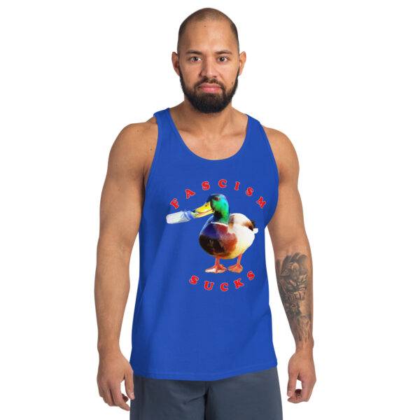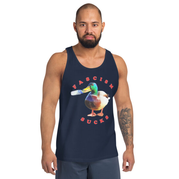 Based on a Mallard duck photographed in Plymouth, Ma., this duck has a statement to make about fascism. A classic, staple tank top with great quality and softness. • 100% combed and ringspun cotton • Tri-blends are 50% polyester/25% combed/25% ringspun cotton/rayon • Fabric weight: 4.2 oz/yd² (142.40 g/m²), triblends: 3.8 oz/yd² (90.07 g/m²) •…