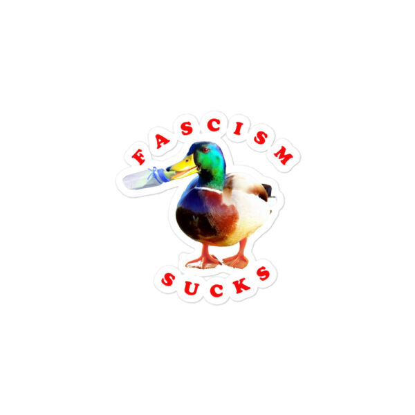 Based on a Mallard duck photographed in Plymouth, Ma., this duck has a statement to make about fascism. These stickers are printed on durable, high opacity adhesive vinyl which makes them perfect for regular use, as well as for covering other stickers or paint. The high-quality vinyl ensures there are no bubbles when applying the…