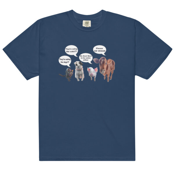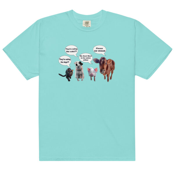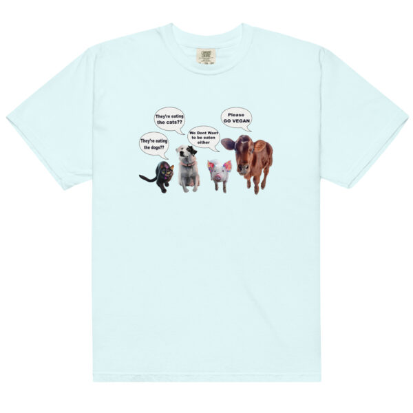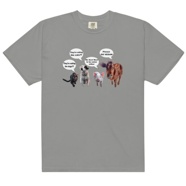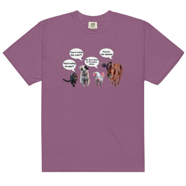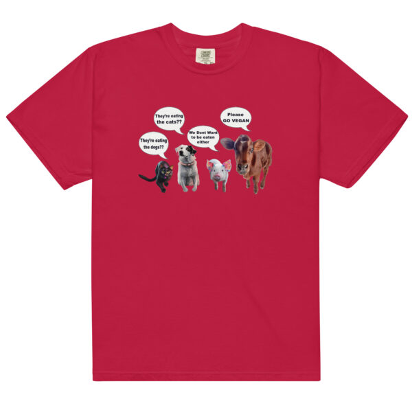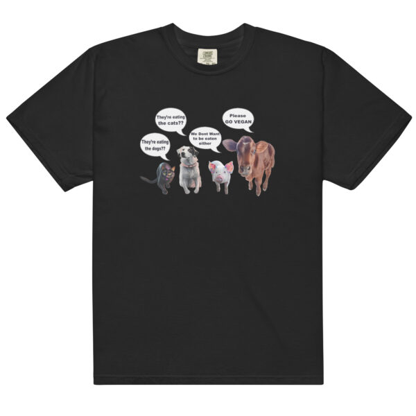 Animals from original photos asking for compassion, and promoting a vegan lifestyle. A thick, structured tee that’s also super soft and breathable Made of 100% ring-spun cotton. • 100% ring-spun cotton • Fabric weight: 6.1 oz/yd² (206.8 g/m²) • Garment-dyed • Relaxed fit • 7/8″ double-needle topstitched collar • Twill-taped neck and shoulders for extra…