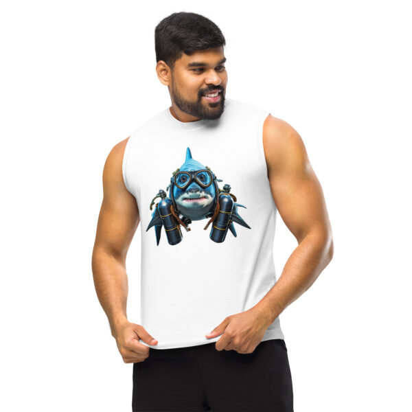 This image is a fun take on a shark captured from the underwater camera at Manatee Lagoon in West Palm Beach, FL. The shark was swimming in the warm waters of the FPL station, which attracts all sea life to the area in the colder months. Yes, sharks can breathe under water, so these tanks may have been “borrowed”.